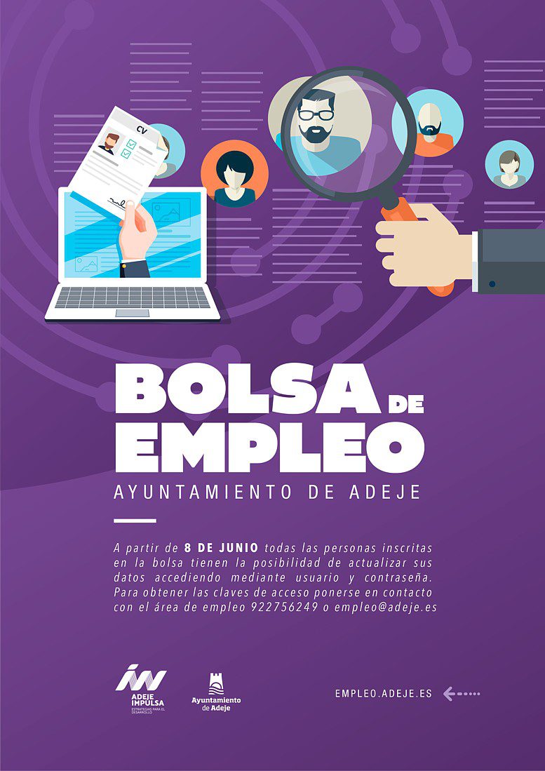 A partir del lunes, 8 de junio los usuarios y las usuarias de “Adeje Global” podrán acceder, previo contacto con el área de empleo, recibirán un correo electrónico de la dirección empleo@adeje.es, seguidamente, rellenarán un formulario y una vez finalizado este procedimiento, las personas interesadas podrán acceder al portal habilitado https://empleo.adeje.es y acceder a su “área privada”.